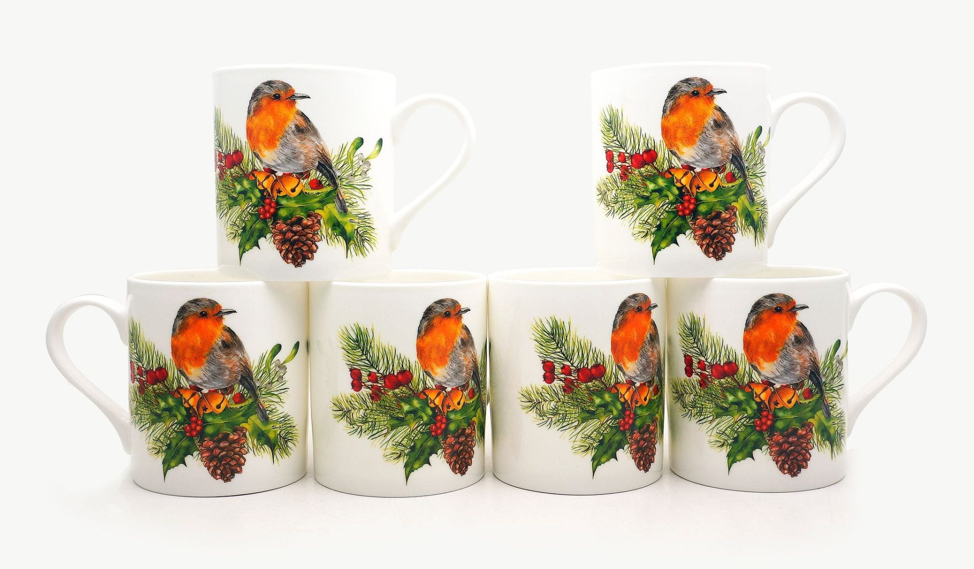 CHRISTMAS ROBINS  set of 6 fine bone china mugs
