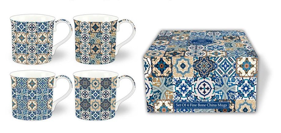Set Of 4 Fine Bone China Mugs Blue Azulejo