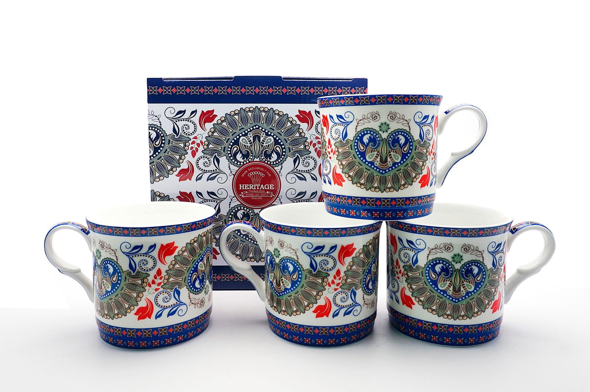 SET OF 4 FINE BONE CHINA MUGS, ALL AROUND PRINT