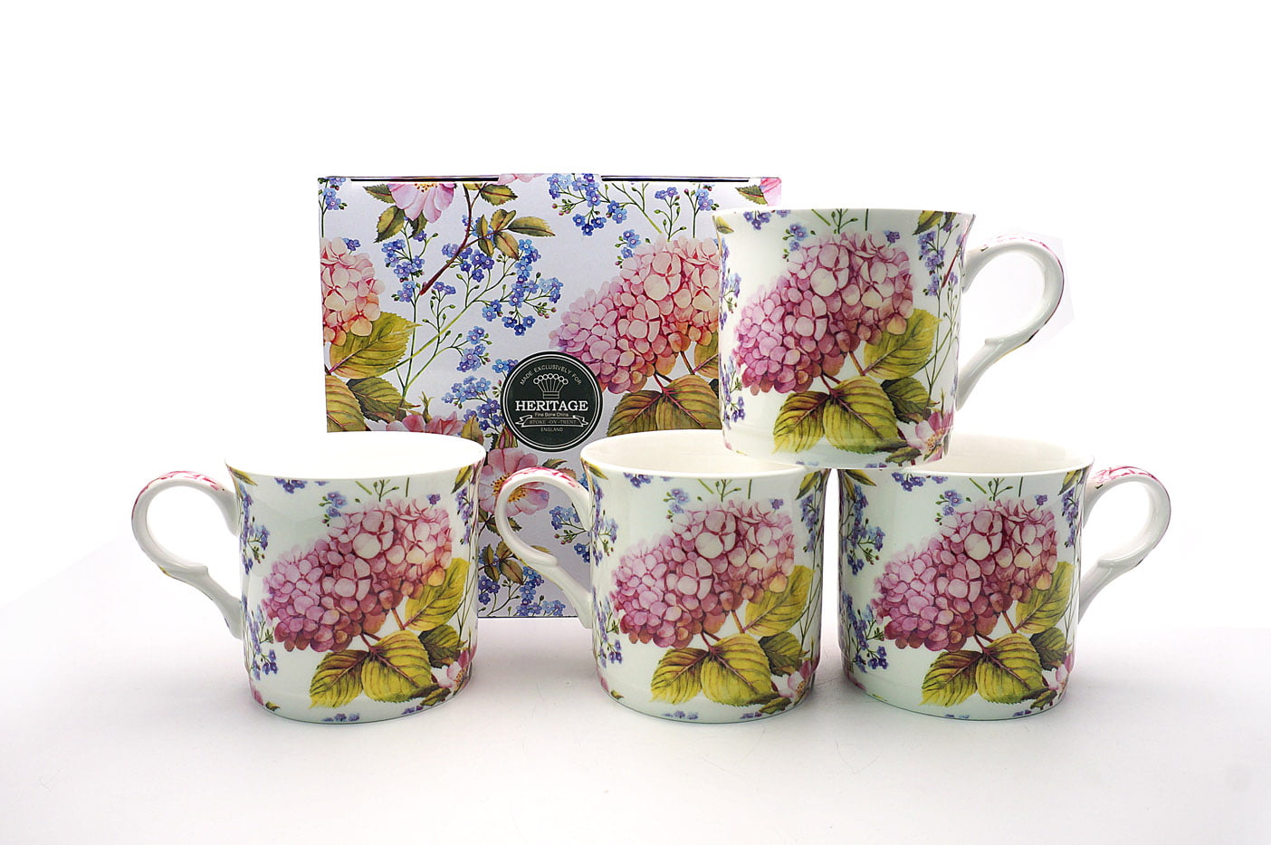 SET OF 4 FINE BONE CHINA MUGS, ALL AROUND PRINT