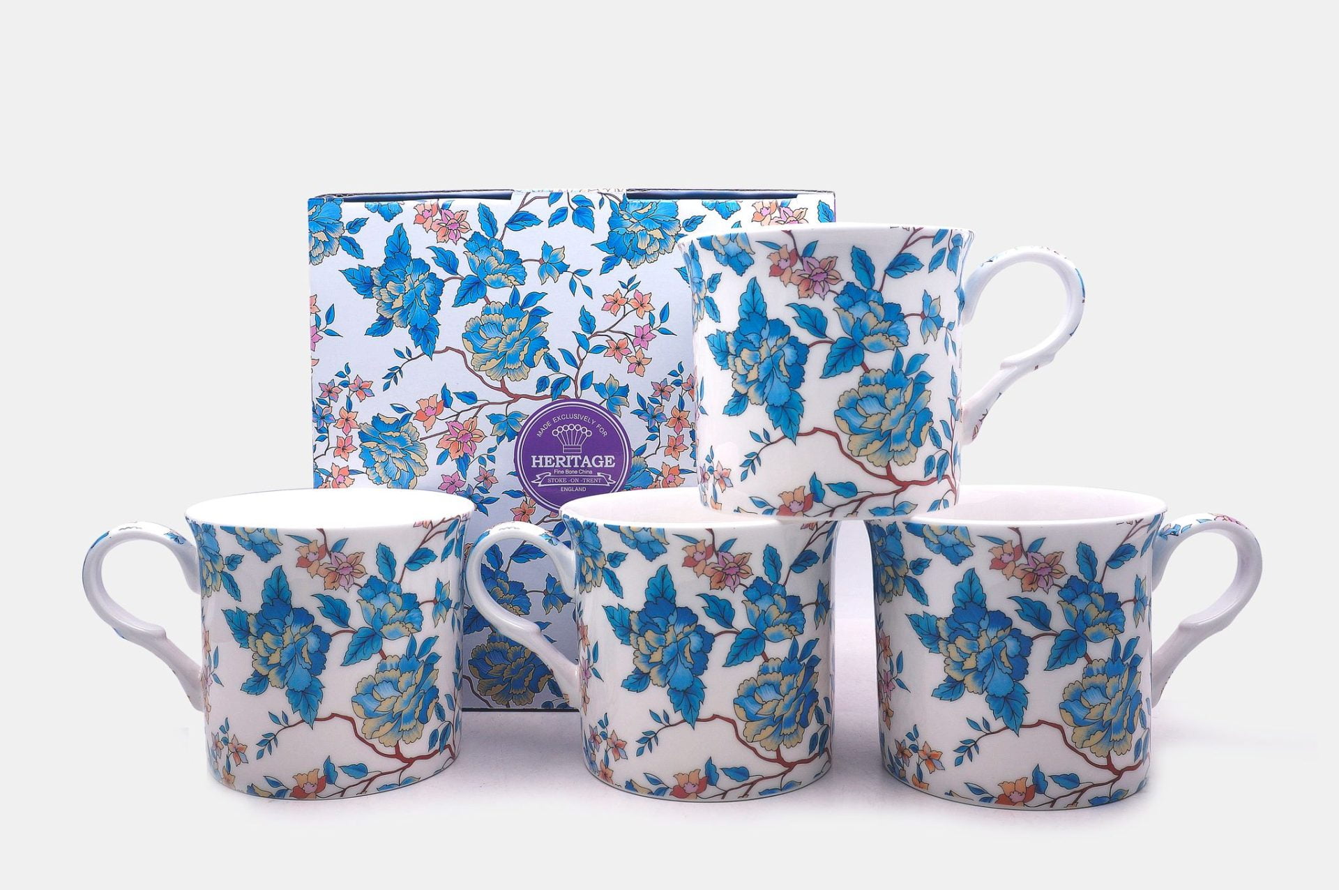 SET OF 4 FINE BONE CHINA MUGS, ALL AROUND PRINT