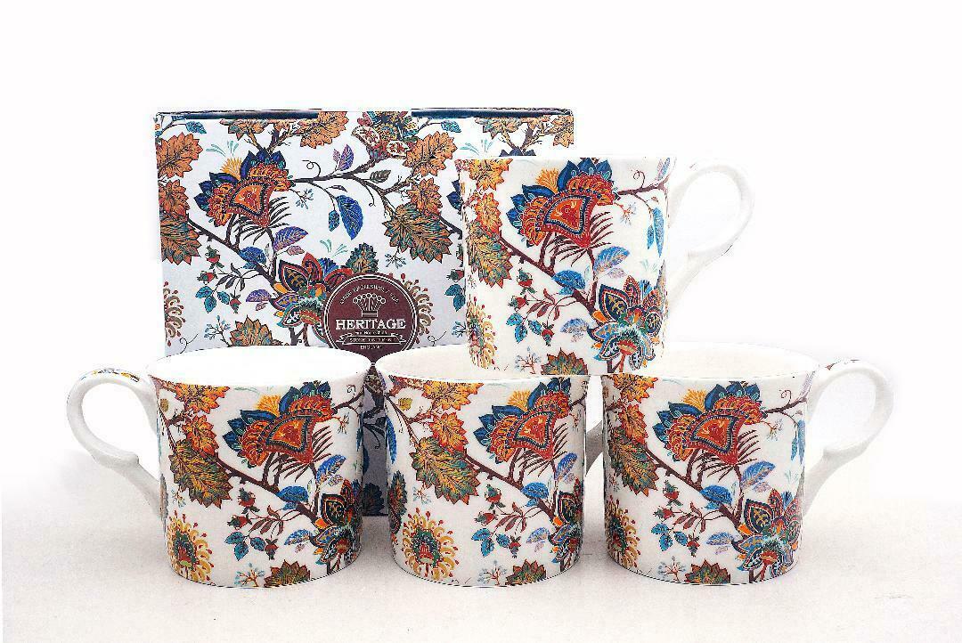 SET OF 4 FINE BONE CHINA MUGS, ALL AROUND PRINT