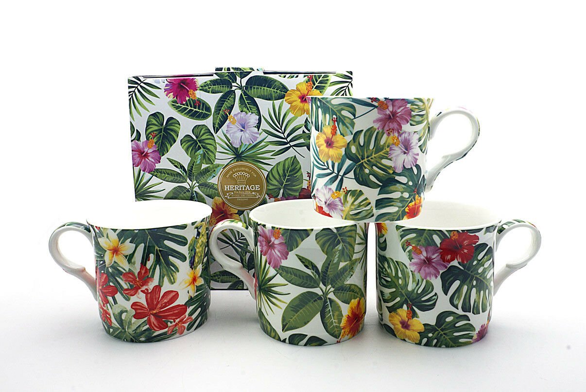 Set Of 4 Gift Tropical Leaves Fine Bone China Mugs