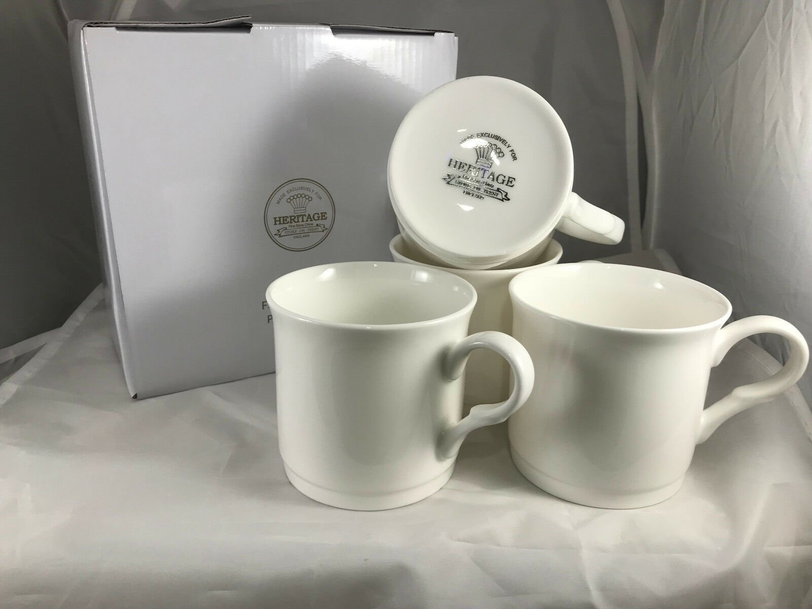 SET OF 4 FINE BONE CHINA GIFT-BOXED MUGS. WHITE BONE CHINA,10 OZ BONE CHINA. MEASURE 3.5 X 3.2 INCHES